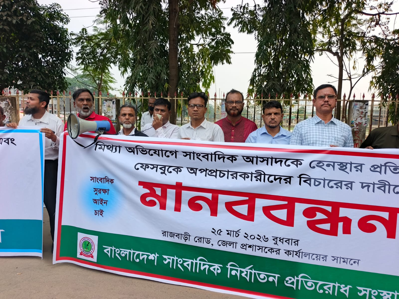 গাজীপুরের পেশাদার সাংবাদিক আসাদুজ্জামানকে পরিকল্পিতভাবে হেনস্তা, ভিডিও ধারণ ও ফেসবুকে অপপ্রচার চালিয়ে সামাজিক মর্যাদা ক্ষুণ্ণ করার প্রতিবাদে মানববন্ধন কর্মসূচি পালন করা হয়েছে। বুধবার (২৫ মার্চ) দুপুরে গাজীপুর মহানগরীর রাজবাড়ী সড়কে জেলা প্রশাসক কার্যালয়ের সামনে এই কর্মসূচি পালিত হয়। গাজীপুরের সাংবাদিক সমাজ, গাজীপুর সদর প্রেসক্লাব ও বাংলাদেশ সাংবাদিক নির্যাতন সংস্থার যৌথ উদ্যোগে আয়োজিত এই মানববন্ধনে জেলার বিভিন্ন গণমাধ্যমে কর্মরত সাংবাদিক ও স্থানীয় সাধারণ মানুষ অংশ নেন। মানববন্ধনে বক্তারা বলেন, একজন পেশাদার সাংবাদিককে অজ্ঞাত পরিচয়ের এক নারীকে দিয়ে পরিকল্পিতভাবে হেনস্তা করানো এবং সেই ঘটনার ভিডিও ধারণ করে ফেসবুকে ছড়িয়ে দিয়ে চরিত্র হনন করা হয়েছে। এটি কেবল আসাদুজ্জামানের ব্যক্তিগত সম্মানহানি নয়, বরং পুরো সাংবাদিক সমাজকে হেনস্তা করার শামিল।