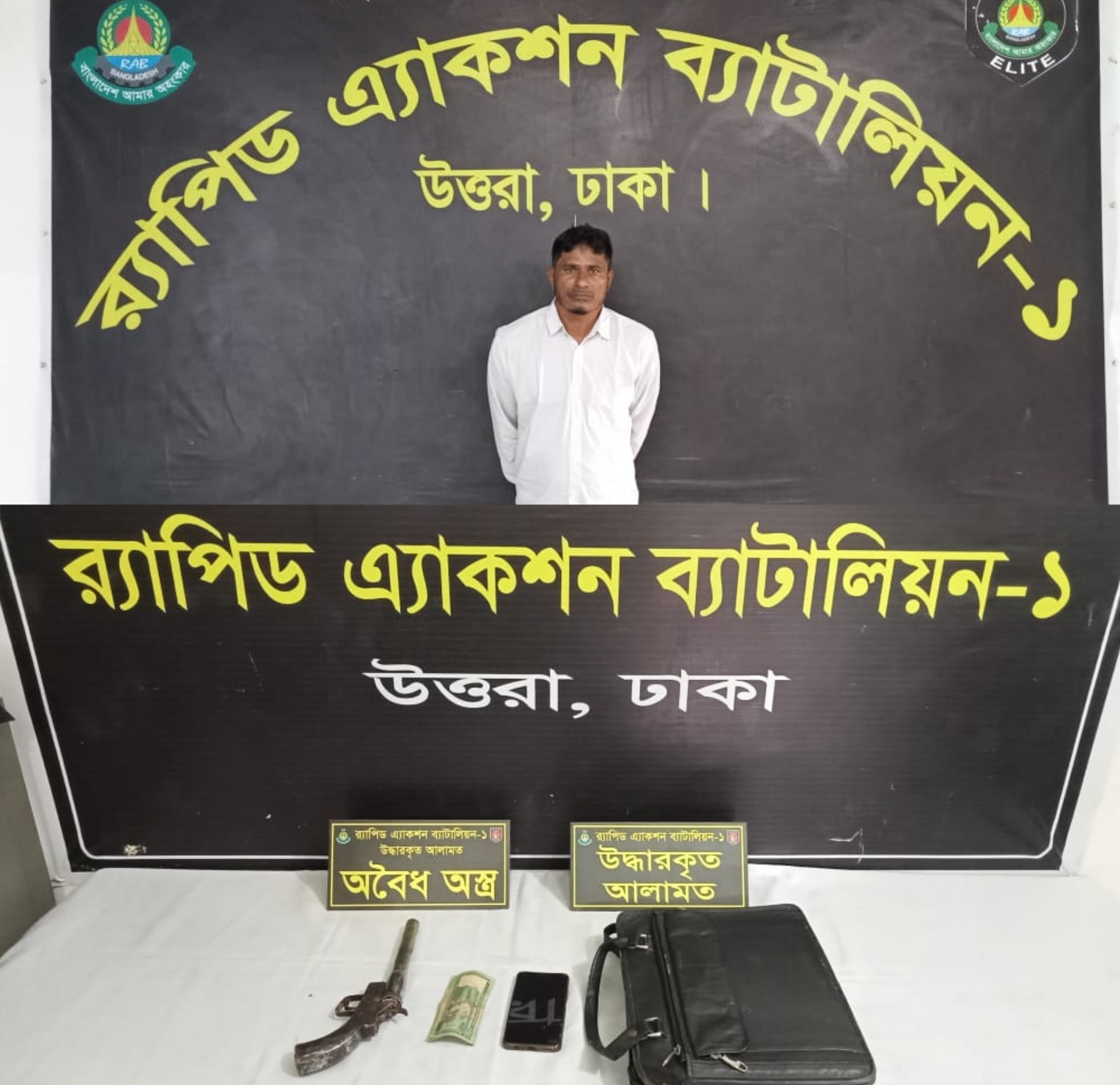 সম্প্রতি উদ্বেগজনকভাবে সারা দেশে ছিনতাই, ডাকাতি, চাঁদাবাজি, খুন ও সশস্ত্র হামলার ঘটনা বাড়ছে। বিশেষ করে রাজধানীতে অস্ত্রধারী কিশোর গ্যাং থেকে শুরু করে অপরাধীরা দাপিয়ে বেড়াচ্ছে। প্রকাশ্যে অস্ত্রধারীদের মহড়ায় আতঙ্কিত সাধারণ মানুষ। বিশেষ করে রাতের বেলায় দেশি-বিদেশি আগ্নেয়াস্ত্র ও ধারালো অস্ত্র নিয়ে দুর্বৃত্তরা হামলা চালাচ্ছে সাধারণ মানুষের ওপর। সম্প্রতি রাজধানীর উত্তরা, বনানী, মোহাম্মদপুর, বনশ্রী, তেজগাঁও, যাত্রাবাড়ীসহ বিভিন্ন এলাকায় প্রকাশ্যে অস্ত্রের মহড়া এবং সাধারণ মানুষের ওপর সশস্ত্র হামলার ঘটনার বেশ কয়েকটি ভিডিও সামাজিক যোগাযোগমাধ্যমে ছড়িয়ে পড়েছে। ভিডিওগুলোতে দেখা যায়, আধিপত্য বিস্তার দ্বন্দের জেরে সশস্ত্র ব্যক্তিরা জনবহুল সড়ক, বাজার কিংবা আবাসিক এলাকায় নির্বিচারে আগ্নেয়াস্ত্র ও দেশীয় অস্ত্র ব্যবহার করছে। অপরাধ দমনে র্যাপিড এ্যাকশন ব্যাটালিয়ন এর গোয়েন্দা ও আভিযানিক দল নিভীরভাবে এসকল অস্ত্রধারী সন্ত্রাসীদের গ্রেফতারের জন্য চিহ্নিত করছে এবং বিশেষ অভিযান পরিচালনা করে আসছে। এরই ধারাবাহিকতায় ইং ১২/০৯/২০২৫ তারিখ র্যাব-১, উত্তরা, ঢাকার আভিযানিক দল গোপন সংবাদের ভিত্তিতে জানতে পারে যে, জিএমপি, গাজীপুর সদর থানাধীন রাজেন্দ্রপুর চৌরাস্তা সংলগ্ন হোটেল নিরিবিলি এর সামনে পাঁকা রাস্তার উপর ০১জন অস্ত্রধারী অবৈধ অস্ত্র নিয়ে অবস্থান করছে। উক্ত সংবাদের ভিত্তিতে বর্ণিত স্থানে ১০১৫ ঘটিকার সময় বিশেষ অভিযান পরিচালনা করে আসামী-মোঃ আব্দুল ওয়াদুদ (৫০), পিতা-মৃত নজির আহাম্মদ, মাতা-মৃত আয়েশা বেগম, সাং-পূর্ব দিঘলী, ভুইয়া বাড়ী, পোষ্ট-দিঘলী বাজার, থানা-লক্ষীপুর সদর, জেলা-লক্ষীপুর, বর্তমান ঠিকানা-ছতর বাজার, বিওএফ এর পাশে মজিবর এর বাড়ির ভাড়াটিয়া, থানা-গাজীপুর সদর, জিএমপি, গাজীপুর’কে গ্রেফতার এবং ০১টি একনালা বন্দুক (দেশী আগ্নেয়াস্ত্র), ০১টি মোবাইল ফোন, ০১টি সিম কার্ড, ০১টি চামড়ার ব্যাগ, নগদ-২৭৫০/- টাকা উদ্ধার পূর্বক জব্দ করা হয়। গ্রেফতারকৃত আসামী ও উদ্ধারকৃত আগ্নেয়াস্ত্র থানায় হস্তান্তর করা হয়েছে।